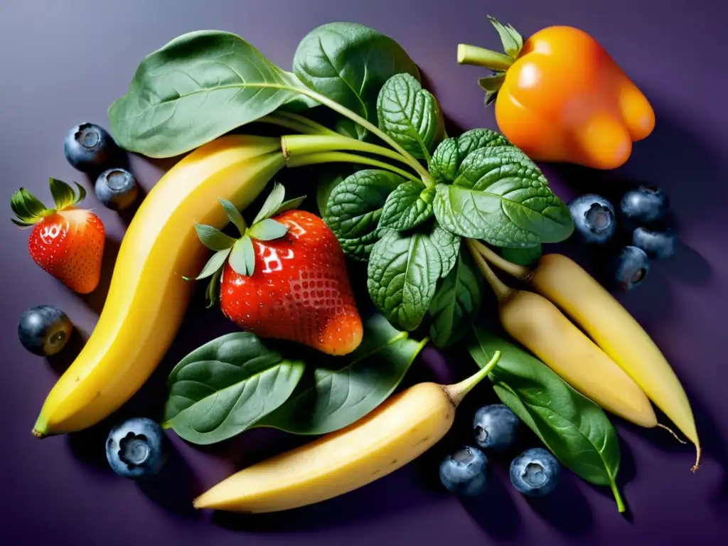 Una variedad de frutas y verduras frescas y vibrantes, perfectamente dispuestas para resaltar sus colores y texturas naturales